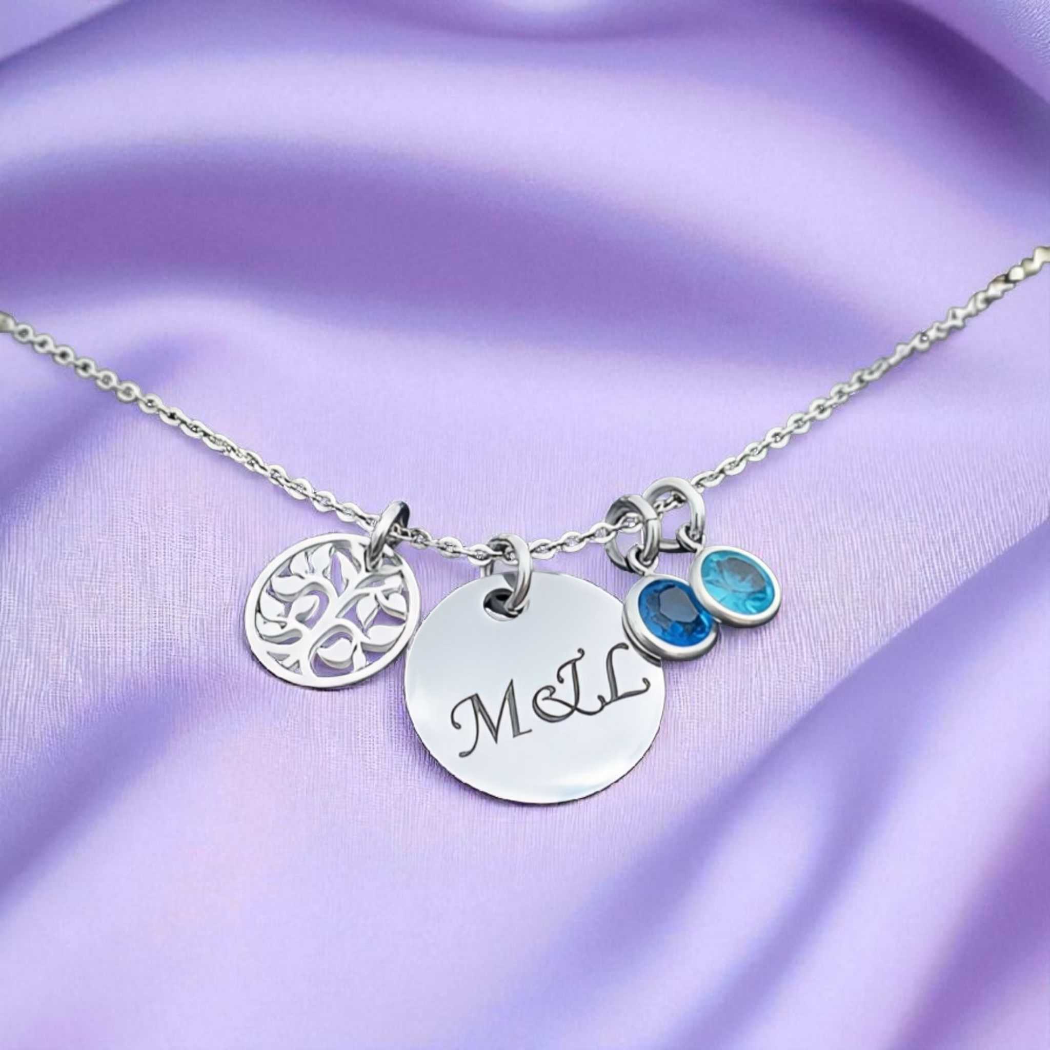 Featuring a Tree of Life charm, a Birthstone pendant of your choice, and a disc charm that can be inscribed with initials. A story message card is included with the necklace to let them know how much you appreciate them being with you.