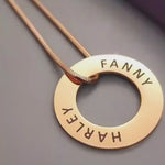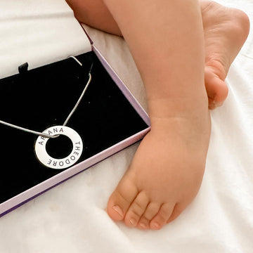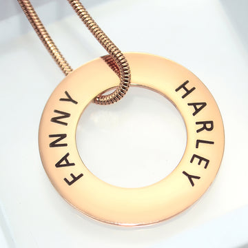 With the ability to inscribe both your names, this necklace will surely melt your loved ones' heart. The round shape of the washer represents never-ending love, making it an ideal gift for any occasion. Available in Silver, Gold or Rose Gold, this necklace will match any outfit and style.