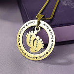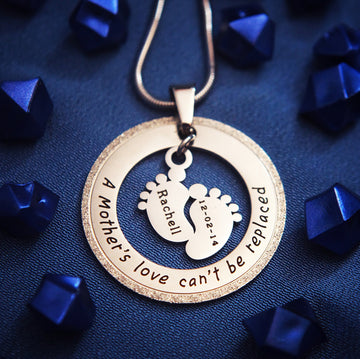 You know, your kids are always going to be your little babies. No matter how big they get, they're always going to be the ones that have the deepest footprints in your heart. That's why I'm the best necklace. I'll help you remember their once tiny little footsies. I'm the bigger version to my sister necklace. I've got two divine little feet that can inscribe names and birthdates on. As your family grows, you can add more footsies to the necklace. I'm here to remind you that a mother's love Can't Be Replaced. So choose me for yourself, or choose me for your mumma. Remind her how much you cherish her.
