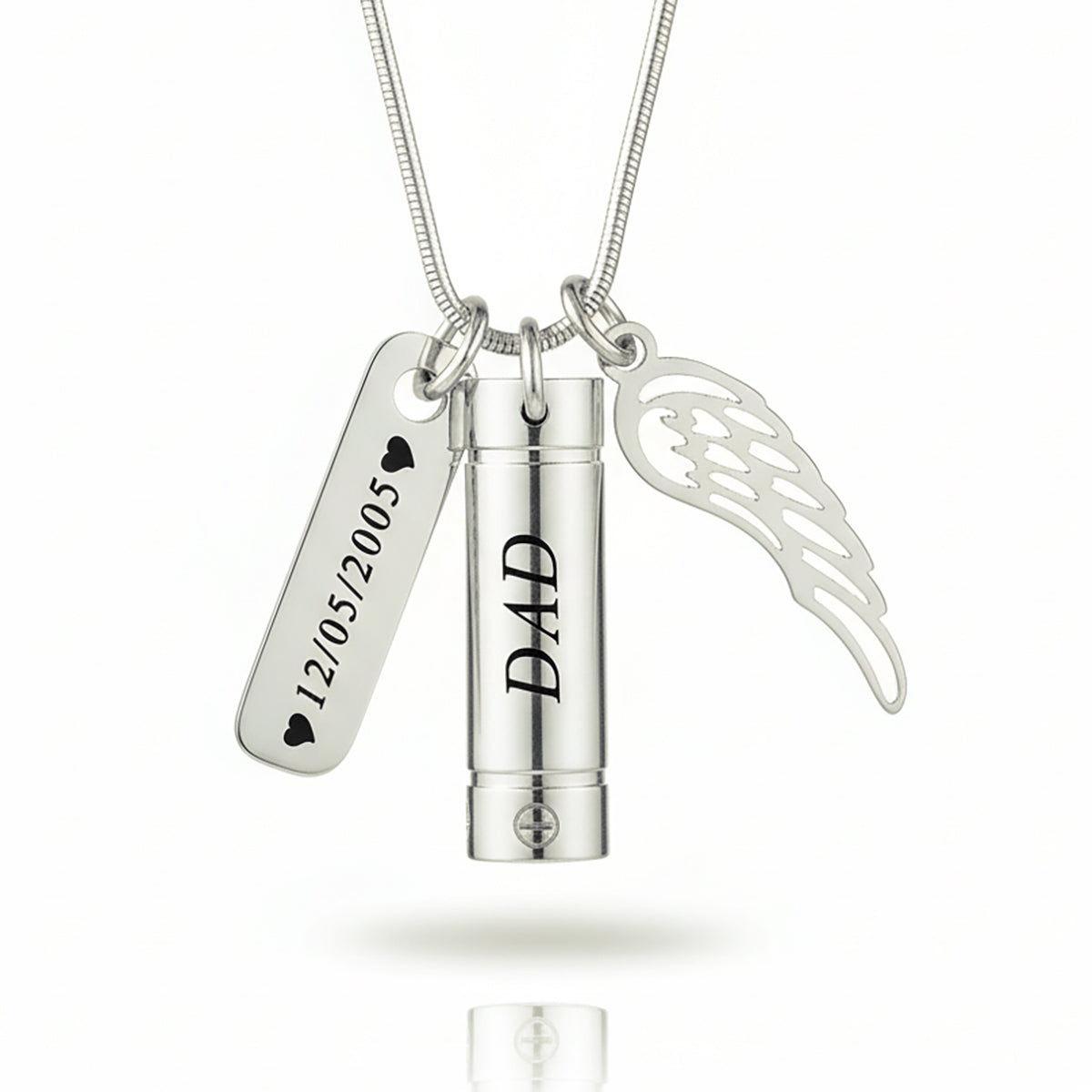 Silver Memory Cremation Necklace by Belle Fever — elegant urn pendant with angel wing and name tag, symbolising eternal love and remembrance.